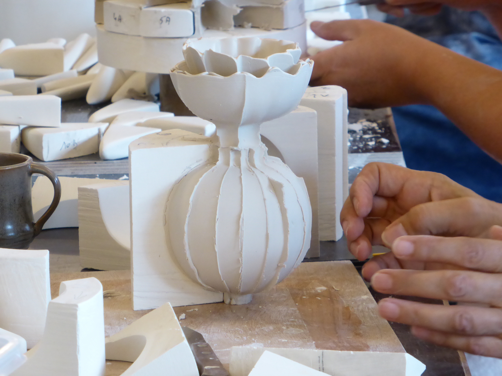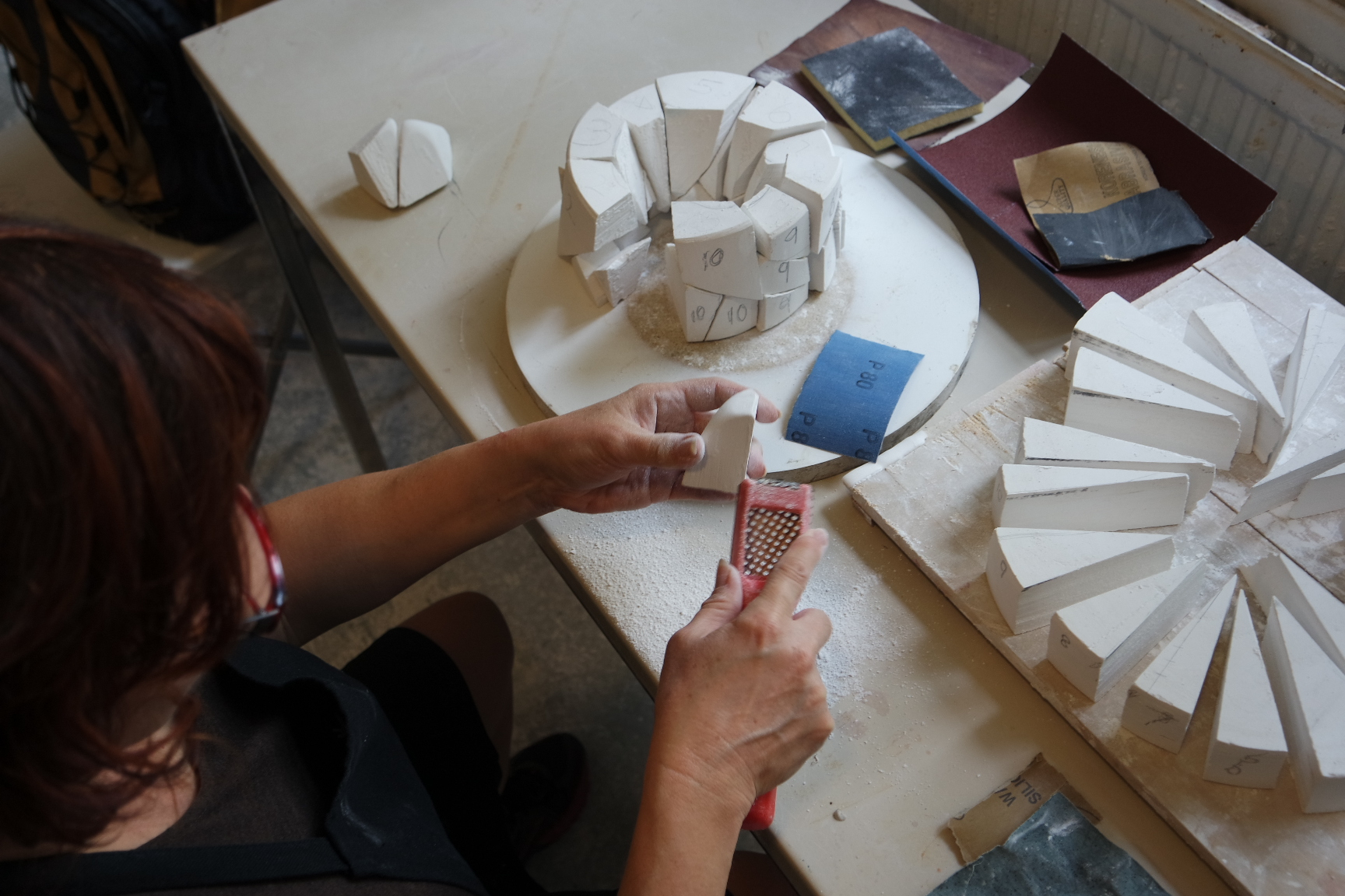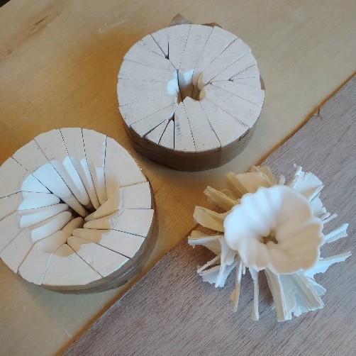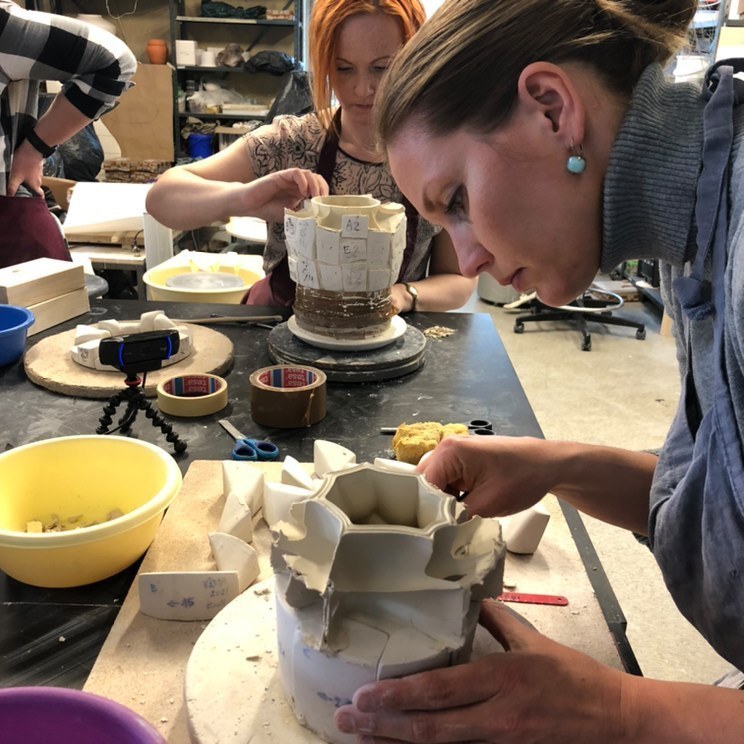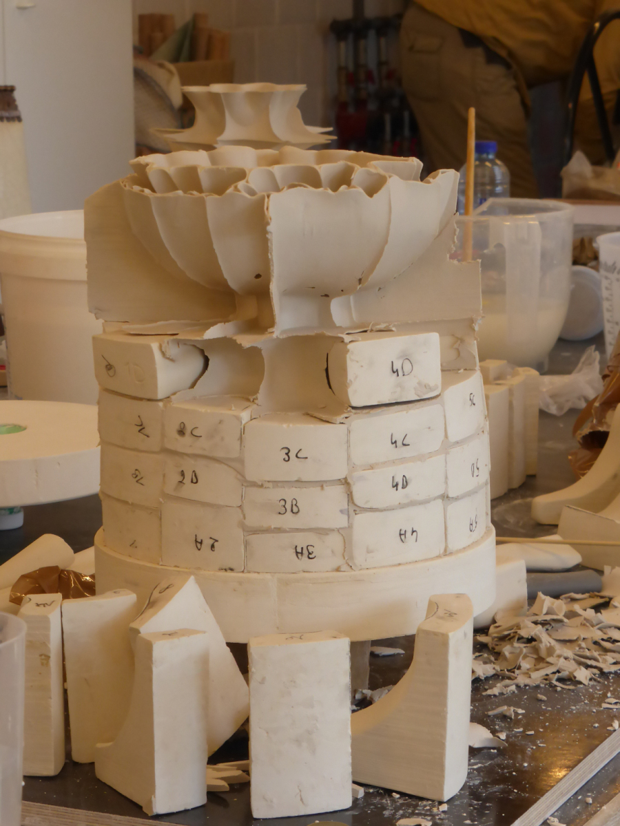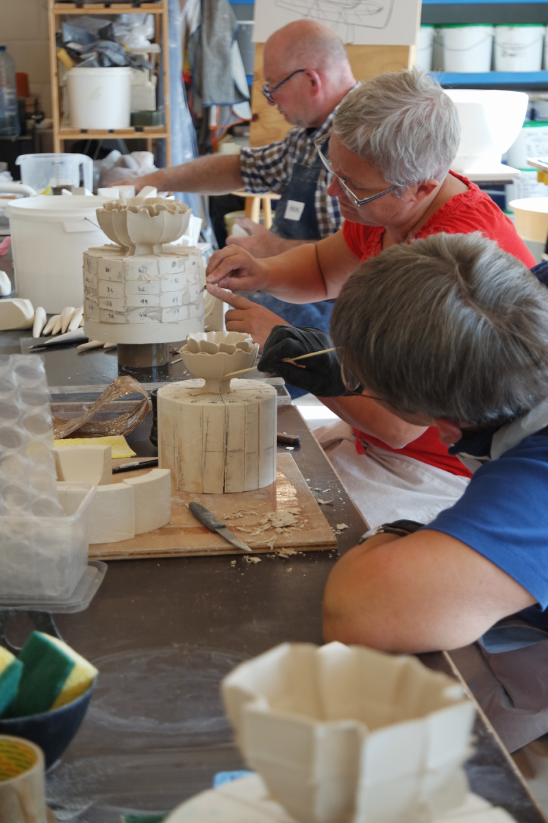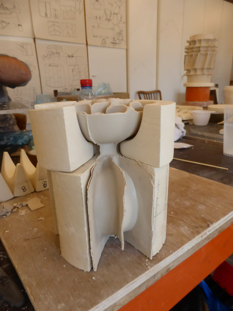 Participants begin working on their individual plans or based on one of Zsolt’s items, through individual consultation, before everyone starts creating their own plaster form. All participants will create a different form, allowing us to learn from each other’s work. We will go through the entire process from mixing the plaster, sawing, sanding and assembling the plaster form all the way to the porcelain casting.