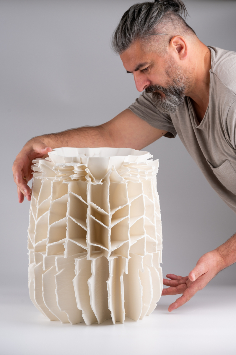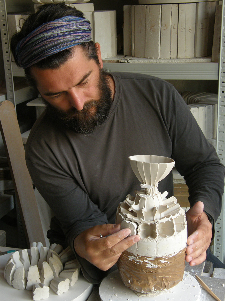 Zsolt József Simon, Born in Celldömölk, Hungary, in 1973, Zsolt developed an early passion for porcelain. After training at the Herend Porcelain Manufactory and graduated as a porcelain designer with a masters degree from the Silicate Department of Moholy-Nagy University of Art and Design, Budapest, Hungary. In 2006, he moved to Indonesia, where he found inspiration in the infinite forces of nature. In 2011, he founded his studio in the suburbs of Budapest, which quickly became a hub for experimental ceramics. Now he settled in Pécs, Hungary which place is famous of the heritage of the Zsolnay porcelain.